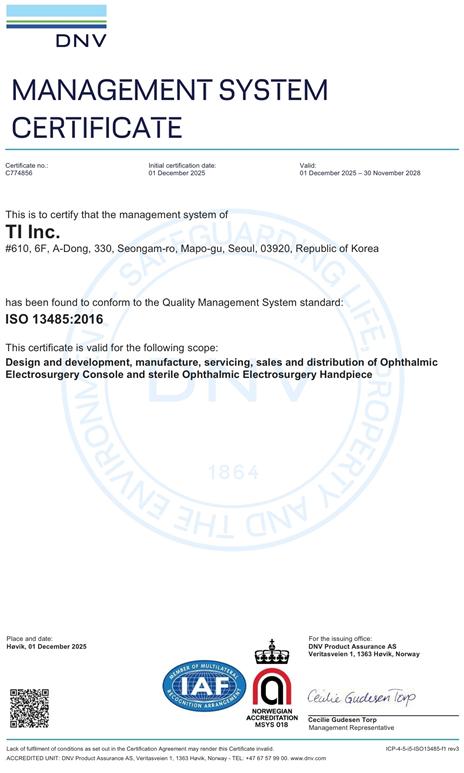 안과 의료기기 기업 티아이가 백내장 수술기구 ‘아이메스(Imass)’로 국제 의료기기 품질경영시스템 표준 ISO 13485 인증을 획득했다. ISO 13485는 설계부터 생산·설치·서비스까지 의료기기 전 과정의 품질관리 체계를 검증하는 국제 기준으로, 유럽연합과 캐나다 등 주요 국가 진출 시 필수 인증으로 요구된다.