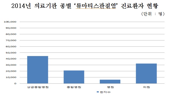 진료 형태는 입원진료의 경우 전체 환자의 5%에 불과했으며 외래와 약국 진료 이용이 많았다. 약국 이용이 많은 것은 류마티스관절염 환자 대부분이 약물치료를 병행하기 때문이다.