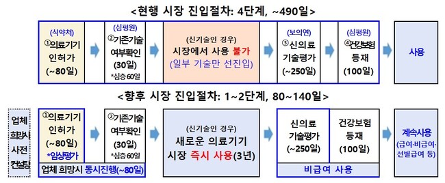 이에 복지부와 식약처는 협업으로 혁신적 의료기술은 별도의 신의료기술평가 없이 시장에 즉시 진입해 사용할 수 있도록 하는 제도를 마련했으며, 이를 위해 ‘신의료기술평가에 관한 규칙’과 ‘의료기기 허가·신고·심사 등에 관한 고시’를 동시에 개정했다.