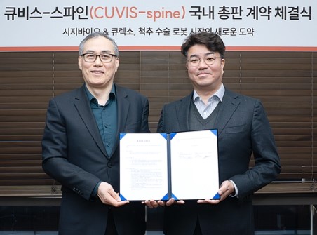 이재준 큐렉소 대표(왼쪽)와 유현승 시지바이오 대표가 30일 ‘큐비스-스파인’ 국내 독점 총판 계약을 체결하고 있다.대웅제약 계열 바이오 재생의료 전문기업 시지바이오(CGBIO)는 의료로봇 전문기업 큐렉소(CUREXO)의 척추 수술 로봇 ‘큐비스-스파인(CUVIS-spine)’을 국내 독점 판매할 수 있는 총판 계약을 체결했다고 30일 밝혔다.