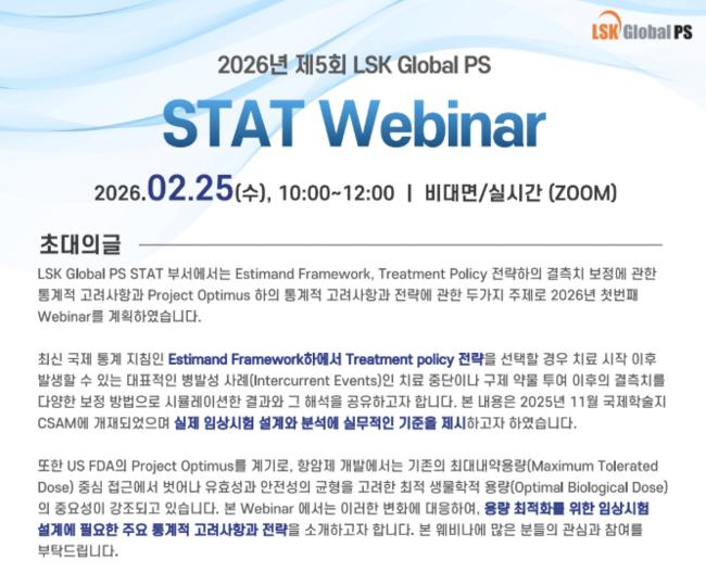 • LSK Global PS 2026년 제5회 ‘STAT 웨비나’ 25일 개최 … 임상시험 통계처리 최신지견 공유
