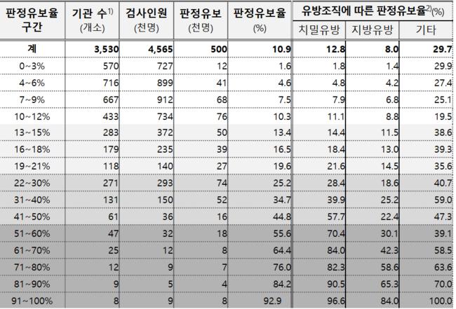 2024년 전체 유방암 검진기관 3530개소의 평균 판정유보율은 10.9%였다. 판정유보율 12% 이하는 2386개소로 67.6%를, 판정유보율 13% 이상 기관은 1144개소로 32.4%를 차지했다. 또 유방조직(구성·밀도)에 따른 판정유보율은 치밀유방 12.8%, 지방유방 8.0%, 기타(보형물) 29.7%로 나타났다.