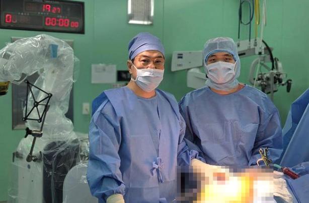 하용찬 서울부민병원장(왼쪽)이 큐렉소 ‘큐비스-조인트 THA’로 고관절 수술을 집도하고 있다.