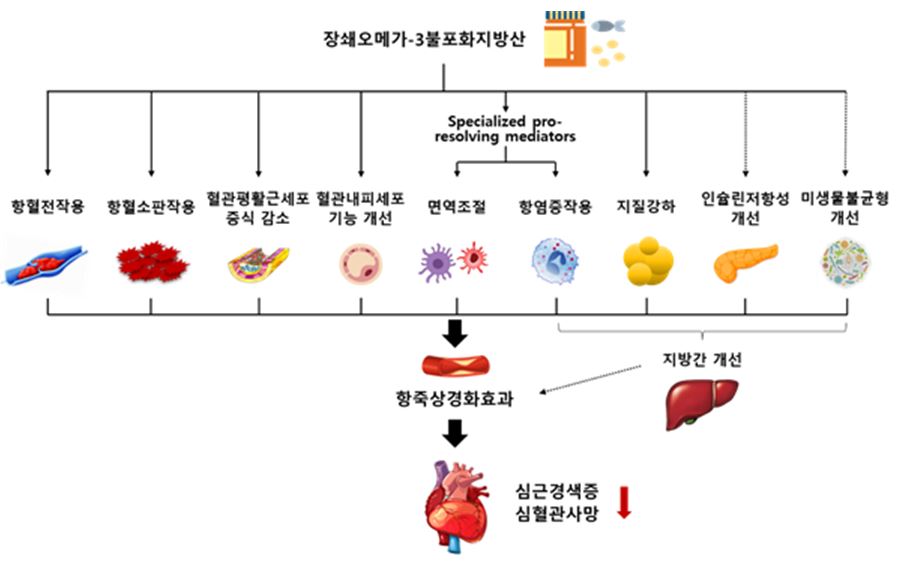 임수 분당서울대병원 내분비대사내과 교수, 배재현 고대안암병원 내분비내과 교수, 임현정 경희대 의학영양학과 교수 연구팀은 장쇄오메가-3불포화지방산(오메가3)의 보충이 심근경색증과 심혈관 관련 사망의 위험을 낮추는데 도움이 된다는 메타분석 연구결과를 보고했다.