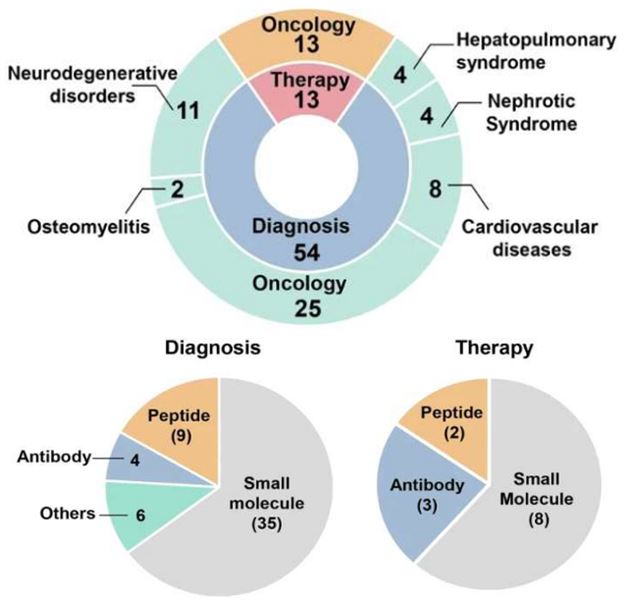 진단용 방사성의약품을 표적 벡터에 따라 분류하면 △저분자화합물이 35개로 가장 큰 비중을 차지하며 △펩타이드 기반 약물이 9개 △항체 기반 약물이 4개 △단백질 및 혈청 알부민 기반 기타 약물이 6개로 나타났다.