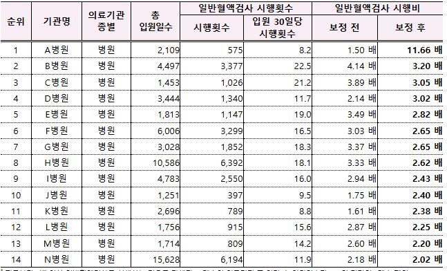 입원 시 일반혈액검사 횟수가 가장 많은 것으로 나타난 A병원은 유사한 진료형태의 의료기관과 비교해 11.66배(보정 후) 높은 것으로 평가됐다. 보정 전엔 평균 대비 1.50배 많았다.