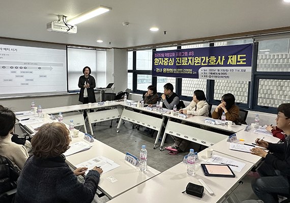 삼성서울병원 홍정희 간호부원장이 강연하는 모습 한국환자단체연합회는 지난 20일 오전 여의도 ‘이룸 회의실 세미나실’에서 제8회 환자단체 역량강화 프로그램을 개최했다. 이번 프로그램의 주제는 ‘환자중심 진료지원간호사 제도’로, 삼성서울병원 홍정희 간호부원장(성균관대 임상간호대학원 교수)이 강사로 초대됐다.
