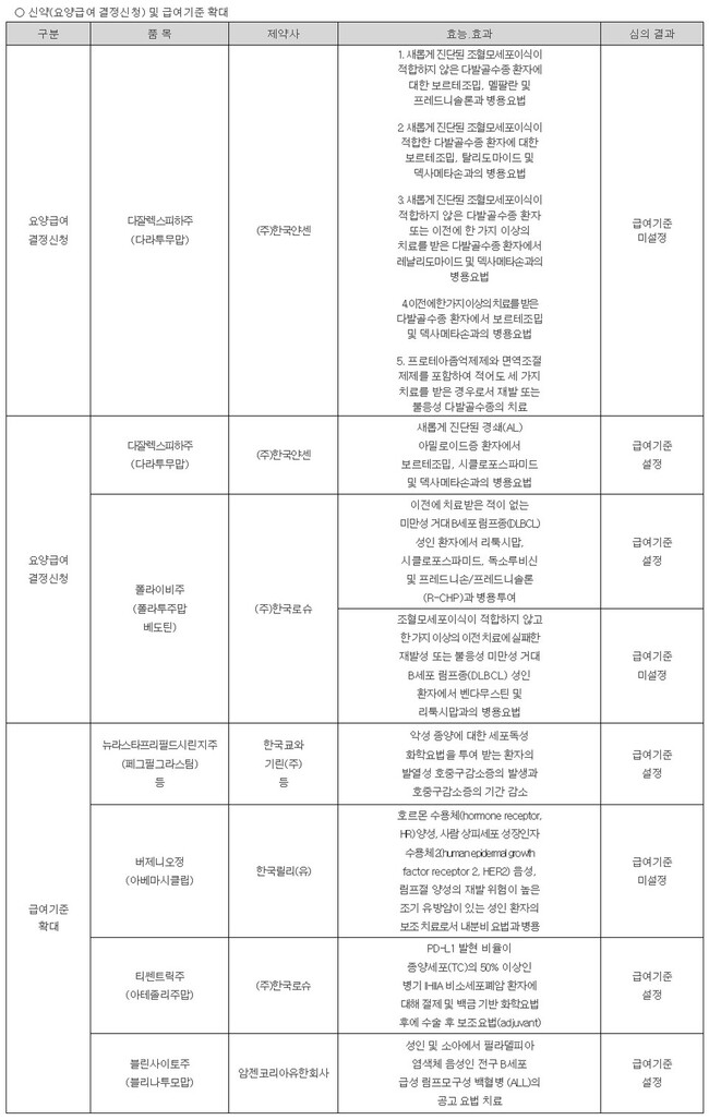 블린사이토는 ‘성인 및 소아에서 필라델피아 염색체 음성인 전구 B세포 급성 림프모구성 백혈병 (ALL)의 공고요법’에, 페그필그라스팀 성분 제제는 ‘악성 종양에 대한 세포독성화학요법을 투여 받는 환자의 발열성 호중구감소증의 발생과 호중구감소증의 기간 감소’ 치료에 급여 기준이 설정됐다.