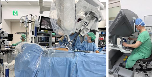 ‘다빈치 SP’를 활용한 단일공 로봇 신장이식 수술 장면. 수술실 내부 (왼쪽), 하종원 서울대병원 이식혈관외과 교수가 콘솔에서 수술을 집도하고 있다 (오른쪽).