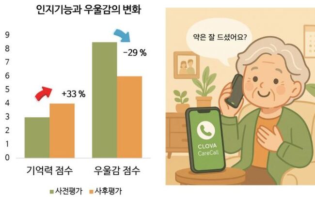 연구 결과, 케어콜 서비스를 받은 치매 환자의 우울척도(GDS) 중앙값은 개입 전 8.5에서 개입 후 6.0으로 유의미하게 29% 감소했으며, 기억력 점수는 33%가량 향상됐다.