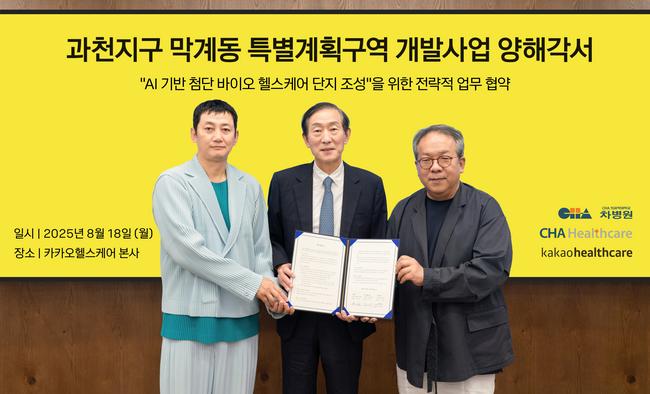 차병원은 차헬스케어, 카카오헬스케어와 함께 ‘과천막계지구 AI 기반 첨단 바이오 헬스케어 단지’ 조성을 위한 전략적 업무협약(MOU)을 체결했다고 18일 밝혔다.