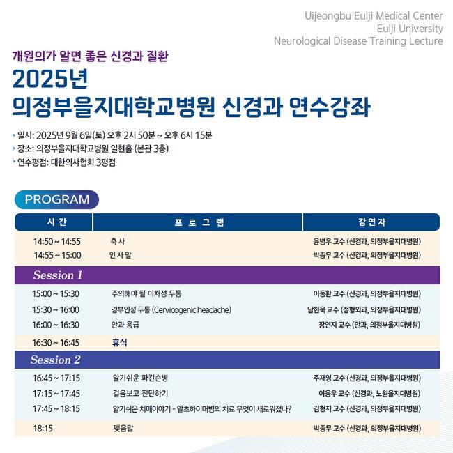 의정부을지대병원 ‘개원의가 알면 좋은 신경과 질환’ 연수강좌 프로그램