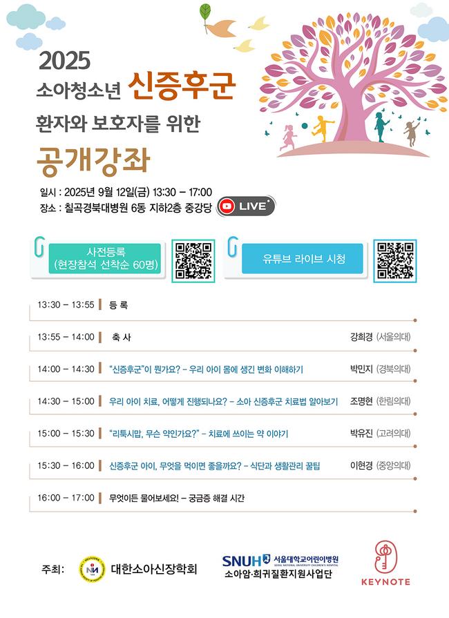 서울대병원 소아암·희귀질환지원사업단이 오는 9월 12일 오후 1시 30분, 칠곡경북대병원 6동 중강당에서 ‘소아청소년 신증후군 환자와 보호자를 위한 공개강좌’를 연다. 이번 강좌는 대한소아신장학회와 공동 주최하며 온·오프라인으로 동시 진행된다.