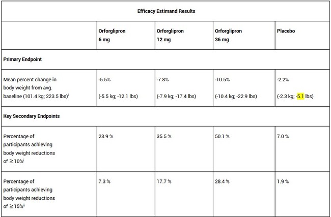 이 임상에서 오르포글리프론은 72주차에 1차 평가지표인 유의미한 체중감량 목표를 달성했다. 식사와 물 섭취를 제한하지 않으면서 오르포글리프론 36mg을 1일 1회 복용한 피험자군은 체중이 평균 10.5%(22.9파운드, 약 10.38kg) 감소한 것으로 나타나 위약 대조군의 2.2%(5.1파운드, 약 2.3kg) 대비 4~5배 더 큰 체중감량 효과를 보였다.