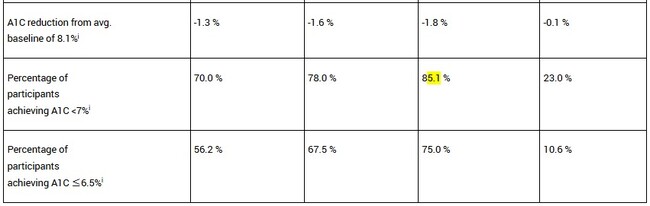 릴리 '오프로글리프론'의 3상 결과, 체중감소 및 당화혈색소 개선 수치(통계처리하지 않은 수치임)오르포글리프론 36mg을 복용한 피험자들의 75%에서 당화혈색소 수치가 6.5% 이하에 도달한 것으로 나타났다(非 통계처리). 위약은 10.6%였다. 당화혈색소 수치 6.5% 이하는 미국당뇨협회(ADA)가 규정지은 당뇨병의 기준선 또는 그 이하에 해당하는 것이다. 피험자들의 착수시점 당화혈색소 수치는 8.1% 수준이었다.