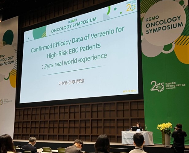 이 교수는 “림프절 양성이 하나라도 확인된다면 재발 고위험군에 속하며, monarchE 연구 코호트 1 기준에서도 이를 반영했기에 버제니오 치료에 적합하다”며 “버제니오는 조기 유방암 수술 후 보조요법으로 활용할 경우 내분비요법 초기 2년 동안에만 복용하는데, monarchE 추적관찰 기간이 길어질수록 내분비요법 단독 치료군과의 IDFS 및 DRFS 개선 결과 차이가 지속적으로 더 커지고 있다. 유방암 재발 위험이 진단 후 1~2년 사이 가장 높다는 점을 고려하면 빠른 치료가 중요할 것”이라고 설명했다. 이수정 칠곡경북대병원 혈액종양내과 교수가 23일 대한종양내과학회 ‘KSMO Oncology Symposium: Best of ASCO 2025’에서 ‘버제니오’에 관한 최신 지견을 발표하고 있다.