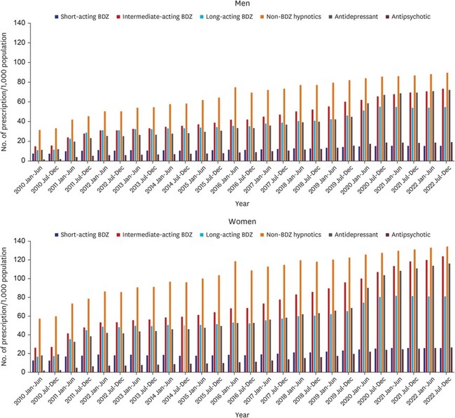 2010년부터 2022년까지 우리나라에서 가장 많이 처방된 수면제는 졸피뎀이었으며, 이어 알프라졸람과 트라조돈 순이었다. 약물 계통 중에서는 졸피뎀 등 非벤조디아제핀 계열이 가장 많이 처방됐고, 그 뒤로 중간 반감기(중시간형) 벤조디아제핀, 저용량 항우울제, 긴 반감기(장시간형) 벤조디아제핀 순이었다. 특히 중간 반감기 벤조디아제핀과 졸피뎀 등 非벤조디아제핀을 함께 사용하는 병용 처방도 흔하게 나타났다. 저용량 항정신병약물과 단시간형 벤조디아제핀이 비슷한 수준으로 가장 적은 처방량을 보였다.