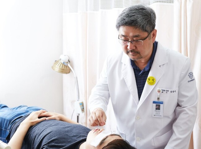 남상수 강동경희대한방병원 침구과 교수가 안면신경마비 환자에게 침치료를 하고 있다.