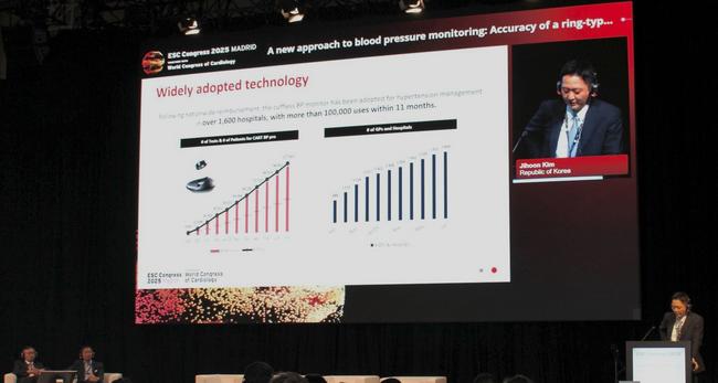 8월 29일부터 9월 1일까지 스페인 마드리드에서 열린 유럽심장학회(ESC 2025) 연례학술대회에서 연구 결과가 공개됐다. 김지훈 삼성서울병원 순환기내과 교수는 ‘측정 높이에 따른 커프리스 반지형 혈압계의 정확도 평가’를 발표하며, 기존 커프형 혈압계와 달리 ‘카트 비피 프로’는 심장 높이와 20cm 이상 낮은 위치에서도 측정값 차이가 없고 표준 청진법과 비교해 일관된 결과를 보였다고 설명했다. 이는 혈액의 중력 효과에 덜 영향을 받아 어느 팔 높이에서도 안정적인 측정이 가능함을 보여준다.