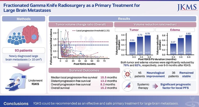 이번 연구는 ‘대한의학회지’(Journal of Korean Medical Science, JKMS, IF=4.5) 최신호에 ‘Fractionated Gamma Knife Radiosurgery as a Primary Treatment for Large Brain Metastases’라는 논문으로 게재됐다.