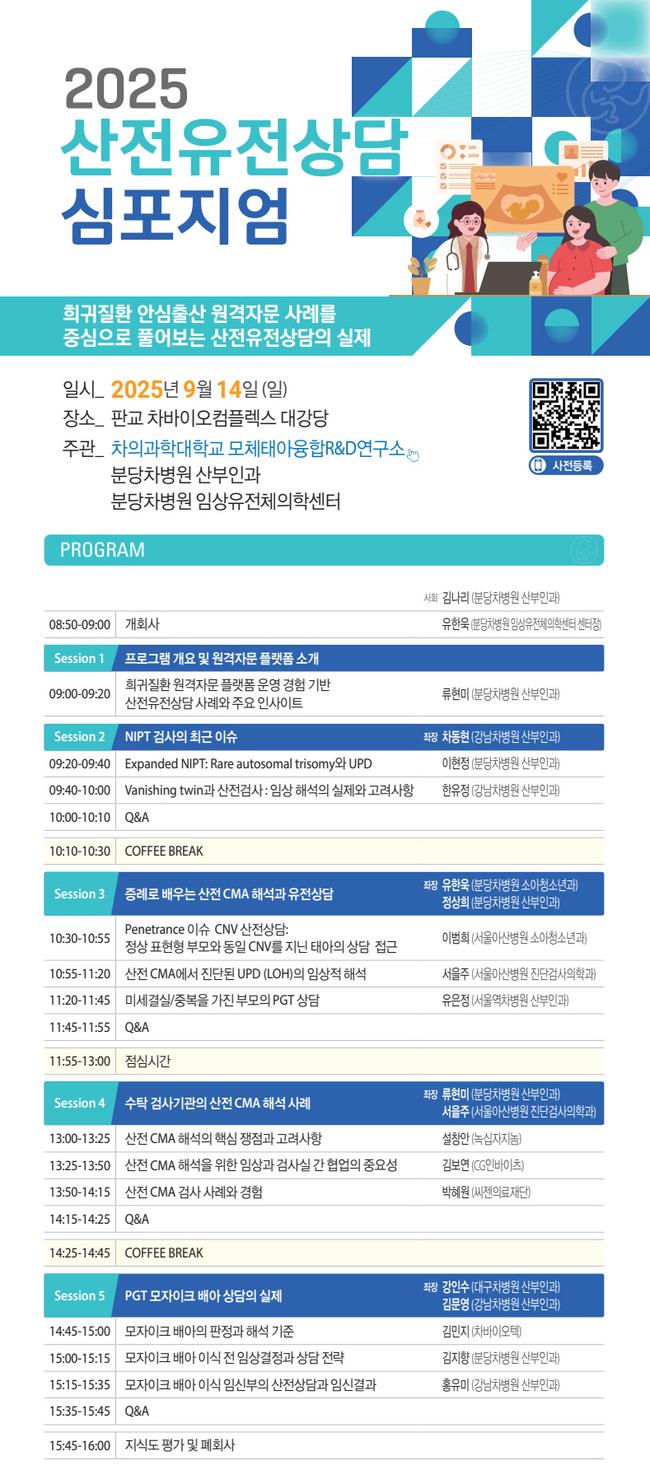 • 분당차병원, ‘2025 산전유전상담 심포지엄’ 14일 개최 … 산전염색체검사, NIPT, PGT 해석과 상담기법 강의
