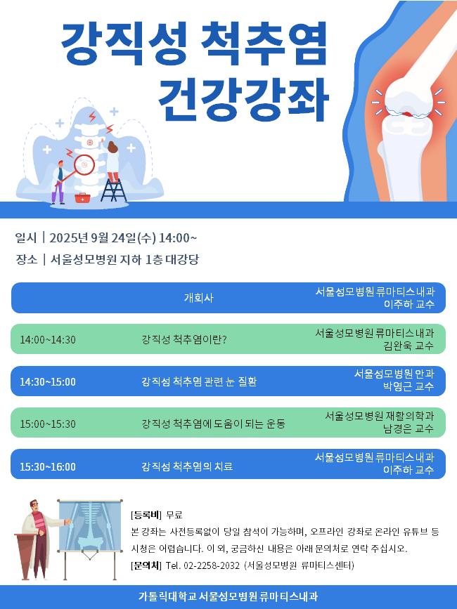 • 서울성모병원, ‘강직성 척추염 건강강좌’ 24일 오후 개최 … 류마티스내과, 안과, 재활의학과 교수 강의