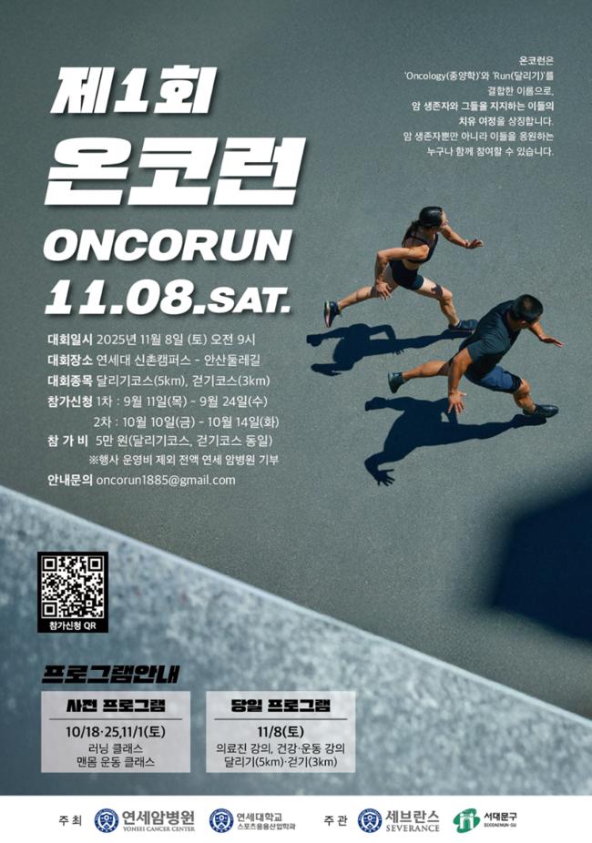 연세암병원 ‘온코런(OncoRun)’ 마라톤대회 포스터연세암병원이 오는 11월 8일 오전 8시 연세대, 서대문구청과 함께 ‘온코런(OncoRun)’ 마라톤대회를 11월 8일 오전 8시 연세대학교 신촌캠퍼스와 안산 둘레길 일대에서 개최한다. 온코런은 종양학을 뜻하는 Oncology와 달리기를 의미하는 Run의 합성어다.
