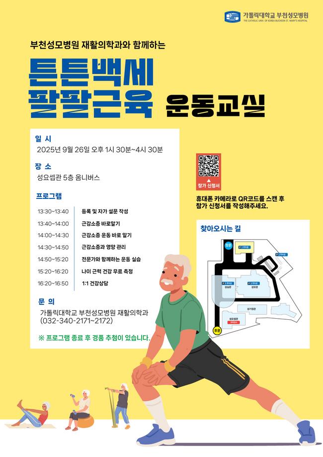 가톨릭대학교 부천성모병원이 고령화 사회에서 증가하는 근감소증 예방과 관리를 위해 내원객과 지역주민을 대상으로 건강강좌를 오는 9월 26일(금) 개최한다.