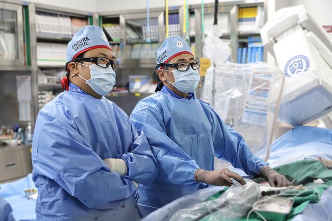 9월 18일 오후 용인세브란스병원 혈관촬영·인터벤션실에서 진행된 ‘앙코르서울 2025’ 라이브 공개 시연에서 김용철 심장내과 교수(오른쪽)와 이오현 교수가 복잡 관상동맥 중재술을 시행하고 있다.