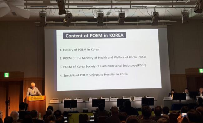 조 교수는 ‘POEM in Korea’를 주제로 한국의 경구내시경근층절개술(POEM, Peroral Endoscopic Myotomy) 발전 과정과 성과, 향후 전망을 발표했다. 특히 Gastrointestinal Endoscopy에 게재된 엔도알컴(Endoalcom) 임상시험 논문을 소개하며 내시경 시술 과정에서의 안정성과 효과 향상 가능성을 공유했다.
