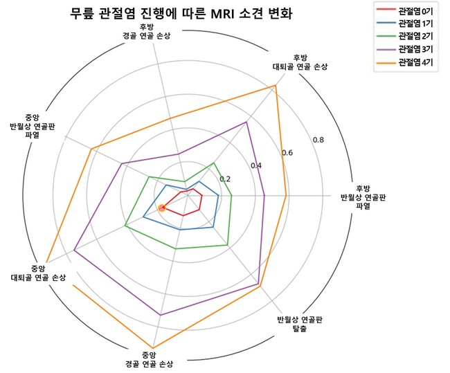 연구팀은 X-레이로 평가한 관절염 진행 단계(0~4기)에 따른 주요 MRI 소견을 최대 7년간 추적 관찰했다.