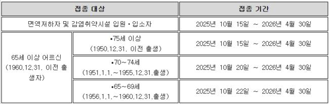 2025-2026절기 코로나19 무료 국가예방접종 사업 일정 올해 국가예방접종사업에서는 인플루엔자 백신의 3가 전환과 코로나19 백신의 최신 변이주(LP.8.1) 적용 등 중요한 변화가 이뤄졌다. 질병청은 코로나19 고위험군의 중증화 및 사망 예방을 위해 지난 절기와 동일한 “65세 이상 어르신, 생후 6개월 이상 면역저하자 및 감염취약시설 입원‧입소자”를 대상으로 접종을 권고했다. 접종대상과 접종기간을 숙지하시어 가까운 의료기관에서 적극적으로 접종빋기를 당부한다. 65세 이상 어르신은 인플루엔자 백신과 코로나19 백신 무료 접종 대상에 모두 해당되므로 의료기관 한번 방문으로 동시에 접종받아 올 가을과 겨울을 안전하게 보내는 게 좋다.