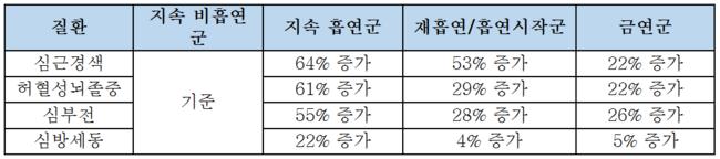 지속 흡연군은 지속 비흡연군 대비 심근경색 위험이 64%까지 높았다. 허혈성 뇌졸중(61%)과 심부전(55%) 위험 가능성도 뚜렷하게 컸다.