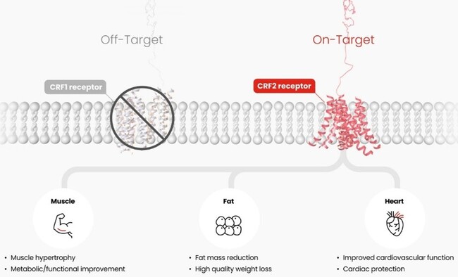HM17321은 GLP-1을 비롯한 인크레틴 수용체가 아닌 CRF2(corticotropin-releasing factor 2) 수용체를 선택적으로 타깃하는 UCN2(Urocortin-2) 유사체로, 한미약품 R&D센터에 내재화된 첨단 인공지능 및 구조 모델링 기술을 활용해 설계됐다. CRF는 스트레스 반응과 관련된 신호 분자로, 그 수용체 중 CRF2 수용체를 선택적으로 타깃하면 지방 감소와 근육 증가, 근 기능 개선 등을 직접 이끌어낼 수 있다는 게 한미약품 설명이다.