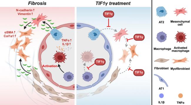 폐 섬유증 악화 및 차단 기전. TIF1γ(Transcriptional intermediary factor 1 gamma) 유전자는 대식세포 흥분 단계, 간엽세포 형질전환 단계, 섬유모세포 활성화 단계에서 모두 차단효과를 발휘한다. TIF1γ는 AT2 세포와 섬유모세포에서 TGF-β 신호를 차단하고, 대식세포에서 염증신호 경로(NF-kB, MAPK)를 복합적으로 차단하여 강력한 항 섬유화 효과를 보인다.