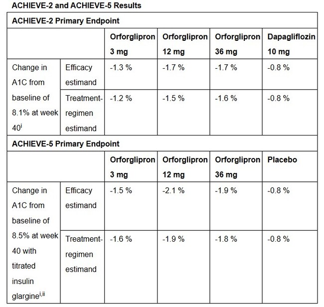 두 임상시험에서 오르포글리프론 3mg, 12mg, 36mg은 40주차에 유효성과 관련한 1차 평가지표(당화혈색소 감소)와 2차 평가지표(체중, 심혈관위험 요인 감소)를 충족했다.