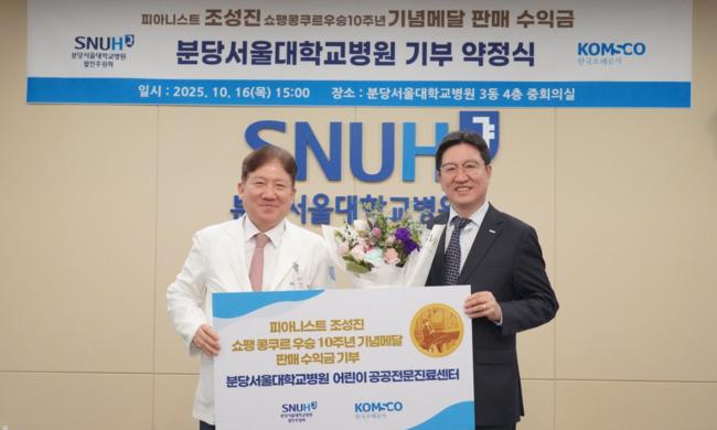 분당서울대병원이 한국조폐공사로부터 ‘피아니스트 조성진 쇼팽 콩쿠르 우승 10주년 기념메달’ 판매 수익금을 기부받기로 했다. 지난 16일 병원 중회의실에서 열린 협약식에는 송정한 병원장과 성창훈 한국조폐공사 사장을 비롯한 양 기관 관계자들이 참석했다.