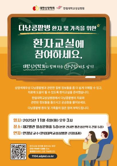 강의는 안정남 한림대 성심병원 신장내과 교수가 맡는다. 안정남 교수는 ‘다낭콩팥병 환자의 질환 이해와 치료 및 관리’를 주제로 질환의 원인과 진단, 약물치료, 생활 관리법 등을 환자 눈높이에 맞춰 설명하고, 이후 질의응답 시간을 통해 환자와 가족의 궁금증을 해소할 예정이다.