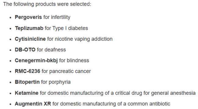 첫 CNPV 수혜 대상에는 △독일 EMDSerono, 퍼고베리스(Pergoveris, 난포자극호르몬 및 황체형성호르몬 복합제, 난임 치료제, 국내서는 독일 머크가 유통) △프랑스 사노피 테플리주맙(Teplizumab, 1형 당뇨병) △미국 워싱턴주 보셀의 애치브라이프사이언스(Achieve Life Sciences, 나스닥 ACHV)의 시티니사이클린(Cytisinicline, 니코틴흡연탐닉증 치료제, 금연용 의약품, nicotine vaping addiction) △미국 리제네론(Regeneron)의 유전성 난청 치료제 ‘DB-OTO’ △이탈리아 Dompé farmaceutici S.p.A의 비동맥염성 전방 허혈성 시신경병증(Non-Arteritic Anterior Ischemic Optic Neuropathy, NAION)에 의한 실명 치료제로서 Cenegermin-bkbj) △미국 캘리포니아주 레드우드시티의 레볼루션메디신(Revolution Medicines. 나스닥 RVMD)의 RMC-6236(성분명 daraxonrasib, 췌장암 치료제) △디스크메디신(Disc Medicine, 나스닥 IRON)의 비토퍼틴(Bitopertin, erythropoietic protoporphyria(EPP) 치료제) △케타민(Ketamine, 미국내 일반 마취제 생산을 위한 필수의약품(critical drug) △오그멘틴 서방정(Augmentin XR, 범용 항생제의 미국내 생산) 등 9 품목이 선정됐다.