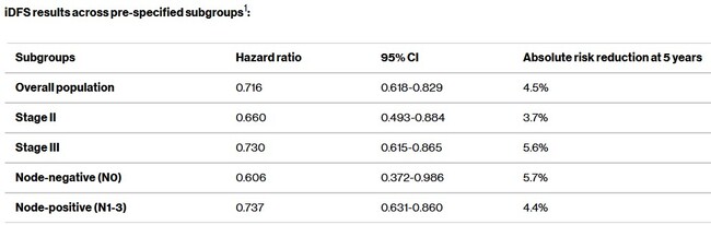 특히 이러한 경향은 임상적으로 의미 있는 주요 하위군 전반에서도 일관되게 나타났으며, 림프절 음성 인자를 가진 고위험 환자군(원래 림프절 음성(N0)은 위험을 낮추지만 이 임상에서는 N0에 해당하면서도 고위험 환자군으로 분류되는 피험자를 포함시킴)에서도 유의한 iDFS 개선 효과(HR=0.606, 95% CI: 0.372–0.986, 5년차에 상대적 위험 39.4% 감소, 절대 위험 5.7%감소)가 관찰됐다. 또한 원격 무전이 생존율(DDFS)을 29.1%(HR=0.709, 95% CI: 0.608-0.827), 원격 무재발 생존율(DRFS) 30.1%(HR=0.699, 95% CI: 0.594-0.824) 개선했다. 즉 원격 전이 위험과 원격 재발 위험을 이같은 비율로 각각 낮췄다.