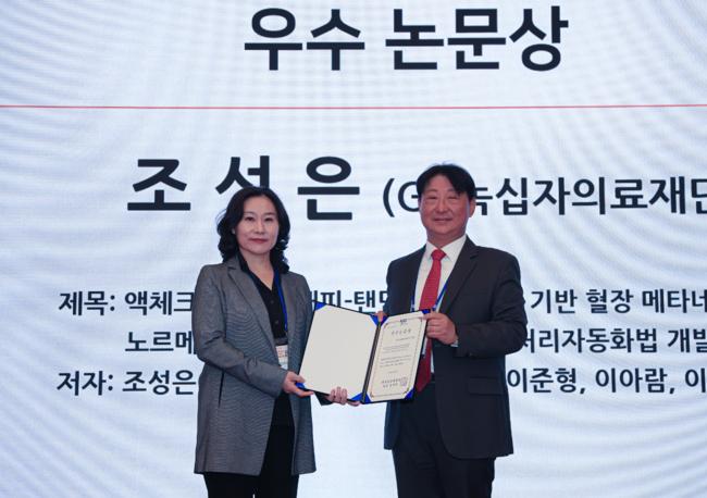 조성은 센터장은 ‘액체크로마토그래피-탠덤질량분석법 기반 혈장 메타네프린과 노르메타네프린 정량검사를 위한 전처리자동화법 개발 및 평가’ 논문으로 우수논문상을 받았다. 이번 연구를 통해 국내 최초로 질량분석 전처리 단계 자동화기기를 도입하고 자체 전처리자동화법을 개발·평가해 임상검사에 적용했다. 그 결과 검사 소요시간이 단축되고 검사자의 업무 부담이 줄었으며, 숙련도에 관계없이 안정적이고 효율적인 검사 수행이 가능해졌다.