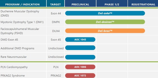 양대 선도 프로그램으로는 PLN 심근병증(phospholamban cardiomyopathy)를 겨냥한 AOC 1086, PRKAG2 증후군((Protein Kinase AMP-activated non-catalytic subunit Gamma 2 Syndrome)을 목표로 삼은 AOC 107이 있다. 이들 프로그램은 각각 전임상 단계로 브리스톨마이어스스큅(BMS), 릴리와 협력을 유지할 예정이다.