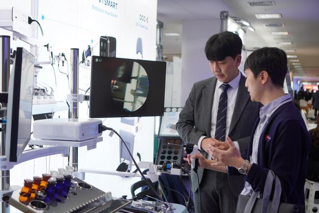 제31차 이비인후과 종합학술대회에서 동아참메드 임직원이 관람객에게 진료용 내시경 ‘V1 SMART’를 소개하고 있다.