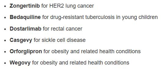 2차 지정 CNPV 품목은 △베링거인겔하임 ‘허넥시오스’(Hernexeos, 성분명 존거티닙 Zongertinib) HER2 변이 양성 비소세포폐암 △존슨앤드존슨(얀센)의 ‘서튜러’(Sirturo, 성분명 베다퀼린Bedaquiline) 소아청소년의 다제내성 결핵 △글락소스미스클라인(GSK)의 ‘젬퍼리’(JEMPERLI 성분명 도스탈리맙 Dostarlimab) 결장암(대장암) △버텍스파마슈티컬스(Vertex Pharmaceuticals)와 크리스퍼테라퓨틱스(CRISPR Therapeutics)가 공동 개발한 ‘Casgevy’(exagamglogene autotemcel 체외 유전자편집치료제) 겸상적혈구질환(sickle cell disease) 치료제 △릴리의 오르포글리프론(Orforglipron) 비만 및 관련 합병증 △노보노디스크 ‘위고비’ 비만 및 관련 합병증 등이다.