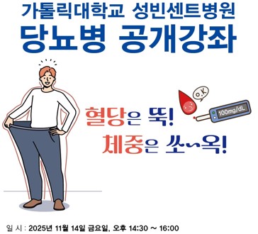 가톨릭대 성빈센트병원은 오는 14일 오후 2시 30분 암병원 10층 성바오로홀에서 ‘혈당은 뚝! 체중은 쏘~옥!’을 주제로 당뇨병 공개강좌’를 개최한다.