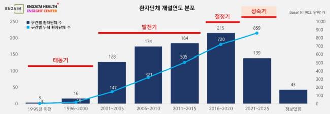 1990년대 태동기를 거쳐 2000년까지 20여개에 그치던 국내 환자단체는 2000년대 초중반을 거치며 매 5년마다 100개 단체 이상씩 생기며 온오프라인에서 폭발적으로 성장했다. 2000년대 초반 환자단체가 이처럼 폭발적으로 성장한 것은 디지털 환경이 발달하면서 환자 결집의 용이성과 익명성 보장이라는 기술적 진보와 함께 환자들 사이에 정서적 연대와 정보 공유의 수요가 급증했기 때문으로 분석된다. 이러한 추세는 2016~2020년 절정에 달했다가, 2021년부터는 성장이 감소하는 추세를 보이며 성숙기에 들어서고 있었다.