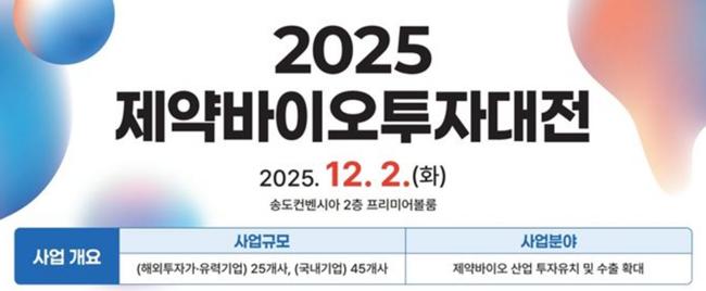 • 인천시-제약바이오협 ‘2025 제약바이오투자대전’ 12월 2일 인천 송도 개최 … 국내외 70개기업 참가해 투자‧수출 상담