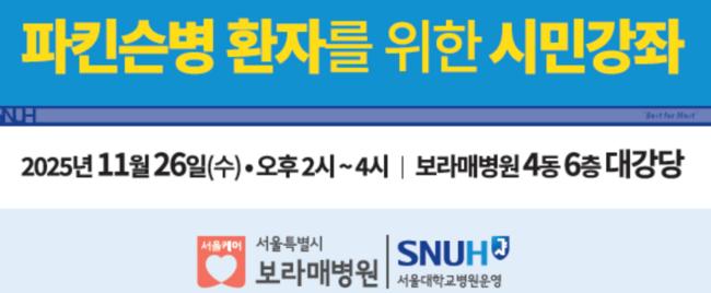 서울시 보라매병원 신경과 파킨슨희귀질환센터는 오는 26일 오후 2시부터 병원 4동 6층 대강당에서 ‘2025년 파킨슨병 환자를 위한 시민건강강좌’를 개최한다.