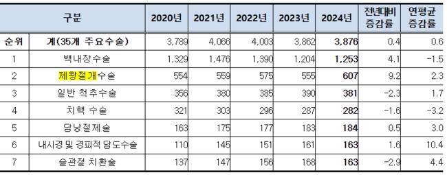 이어 일반 척추수술(20만2099건), 제왕절개술(16만804건) 순이다. 척추수술은 전년 대비 2.3% 감소했지만 제왕절개수술은 9.3% 증가했다.