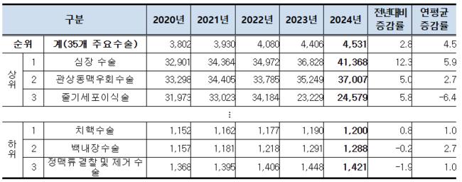연도별 인구 10만 명당 다빈도 상위 주요수술 (단위: 건, %)지난해 35개 주요 수술 진료비는 9조3075억원으로 전년보다 3.3% 늘었다. 5년간 연평균 5.1% 증가했다. 주요 수술 건당 진료비는 453만원으로 전년보다 2.8% 증가했다. 5년 동안 연평균 4.5% 늘었다.
